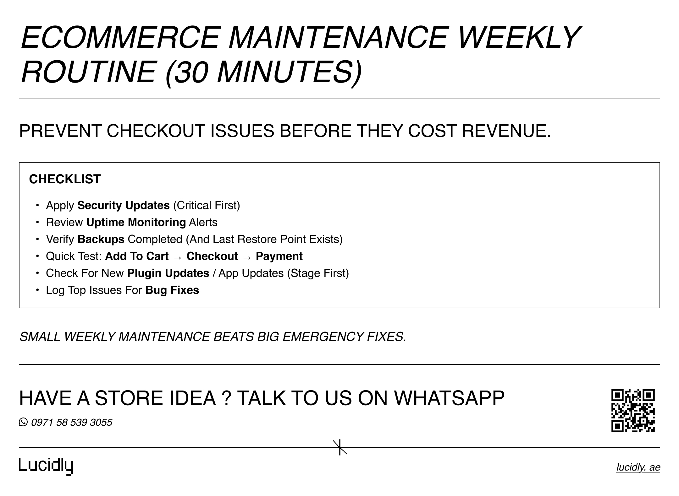 Need ecommerce maintenance support? Message Lucidly on WhatsApp—or book a quick audit via our Contact Us numbers.